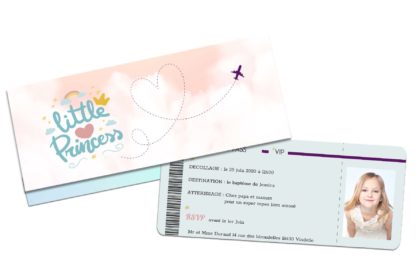 Ce faire-part billet d’avion est composé de sa pochette et de sa carte d’embarquement coordonnée dans les tons bleus.
